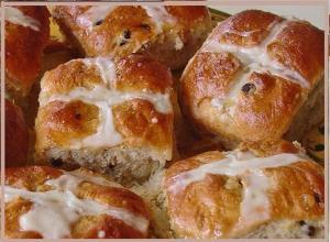 Hot cross buns are delicious cakes eater around Easter time. The cross on the top is a symbol of the crucifixion.